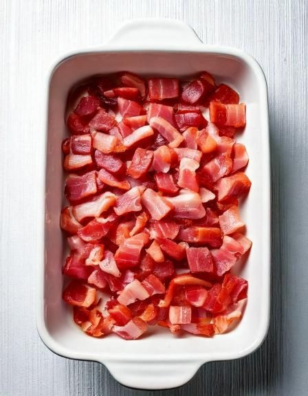 Adăugați slănină crudă, tăiată cubulețe, în caserolă. Cu doar 5 ingrediente: Micul dejun pentru cină este gata. Vedeți detaliile în primul comentariu.