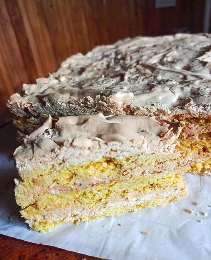 Aluat fraged cu umplutură de caramel, bezea și migdale. Delicios, delicat și care se topește în gură.