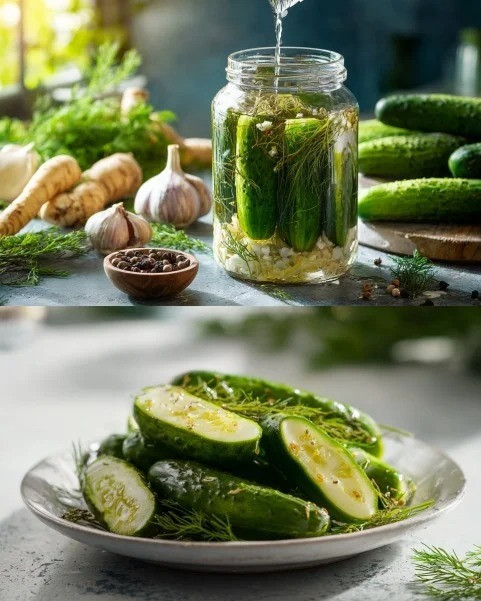 6️⃣ Turnați peste castraveți până când sunt complet acoperiți – apăsându-i cu o farfurie, dacă este necesar.