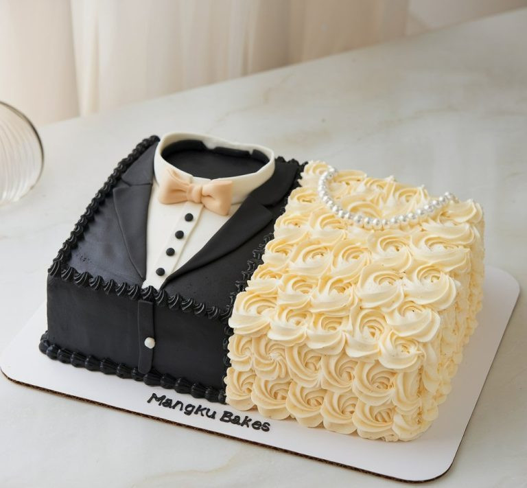 Un design creativ în care tortul este împărțit în două jumătăți. O jumătate seamănă cu un smoking de mire, cu fondant negru, un papion auriu și nasturi. Cealaltă jumătate este decorată cu trandafiri albi ca gheața și un colier de perle, reprezentând rochia de mireasă. Acest tort este perfect pentru nunți, logodne sau zile de naștere. Iată cum se face o prăjitură similară: